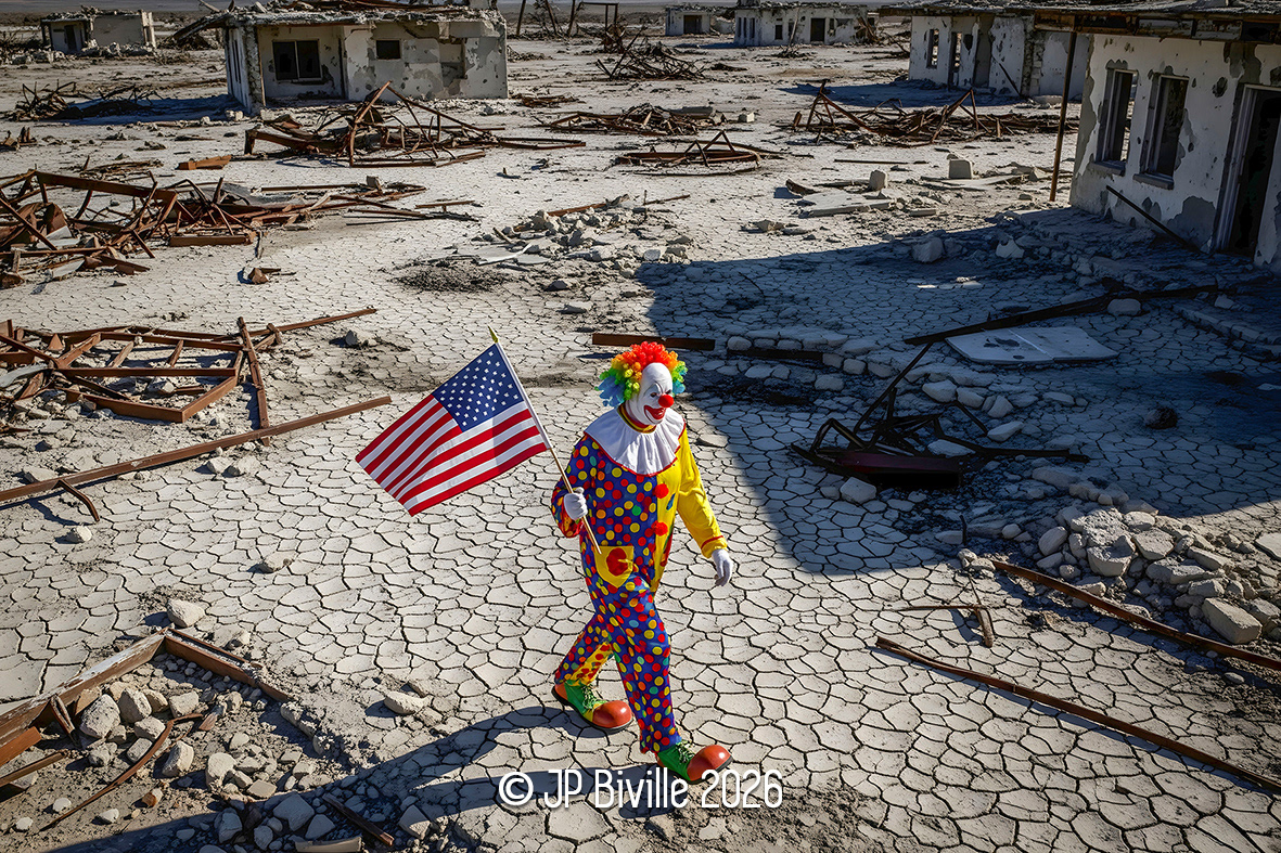 Dans un paysage ravagé, un clown solitaire brandit le drapeau d’une nation dominatrice, comme s’il ouvrait un défilé. Mais ici, il n’y a plus de public. Plus de scène. Juste les restes d’un monde effondré. Le rire devient masque, le patriotisme un accessoire, et la paix un décor de carton-pâte.