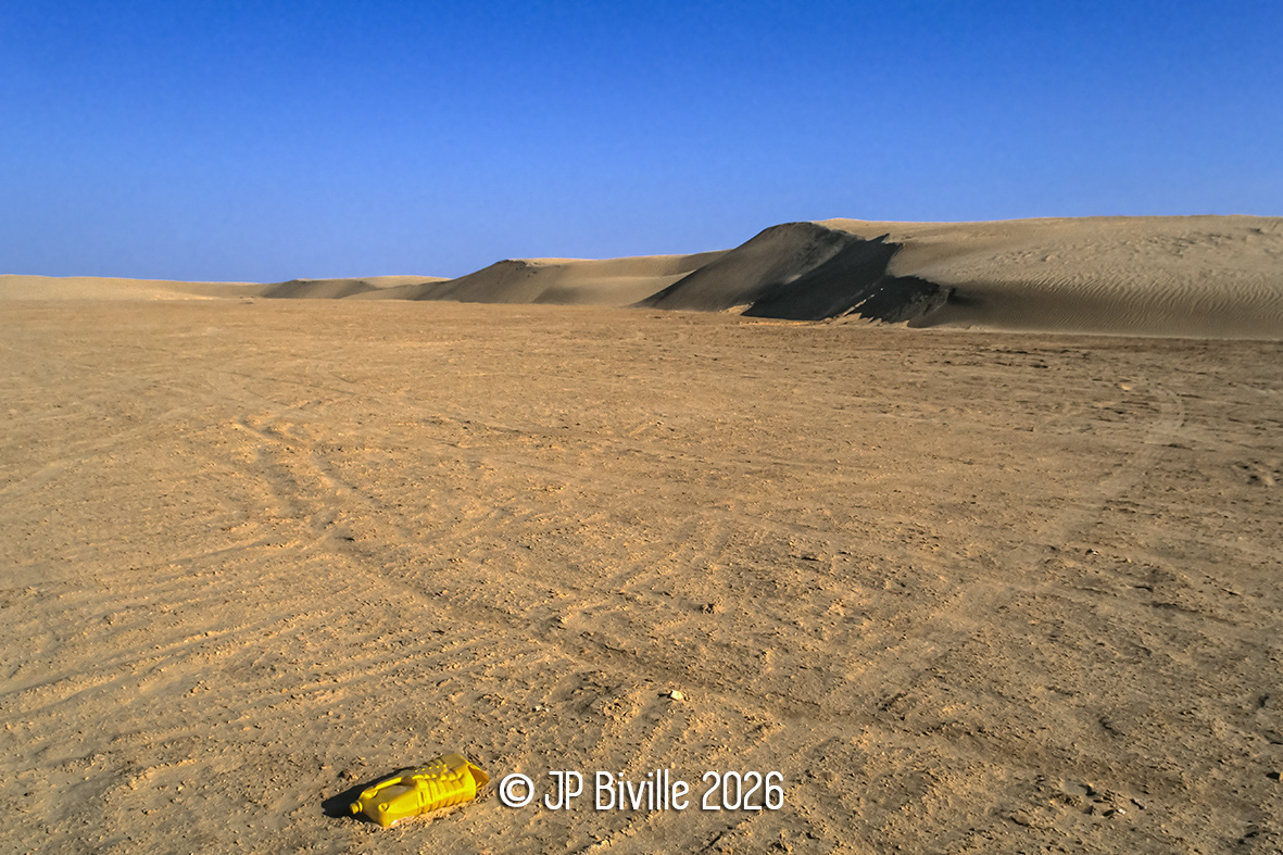 Cette photographie capte un instant de déséquilibre : celui où la nature, vaste et silencieuse, se heurte à une trace humaine — dérisoire, mais significative. Un objet plastique abandonné, des marques de passage, et ce désert qui semble vouloir tout effacer. Elle suggère que nous avons franchi une limite. Ce n’est pas l’empreinte en soi qui dérange, mais son excès, son absurdité, sa persistance là où elle n’a rien à faire. Dans ce décor aride, chaque trace devient un cri. Un rappel que même les lieux les plus reculés ne sont plus épargnés. Une empreinte de trop, c’est celle qui ne s’efface pas. Celle qui ne devrait pas être là.
