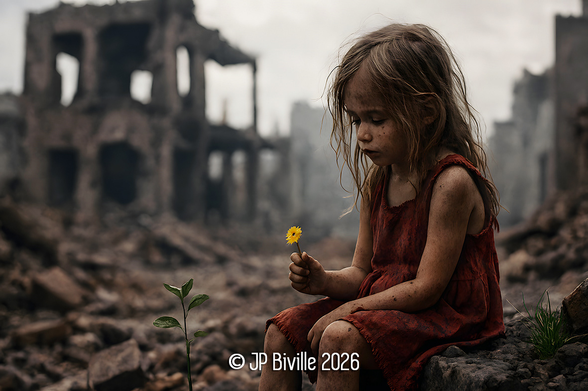 Dans les décombres d’un monde brisé, une enfant tient une fleur. L’innocence persiste, fragile mais indomptable. Là où tout semble perdu, la vie s’obstine à renaître.