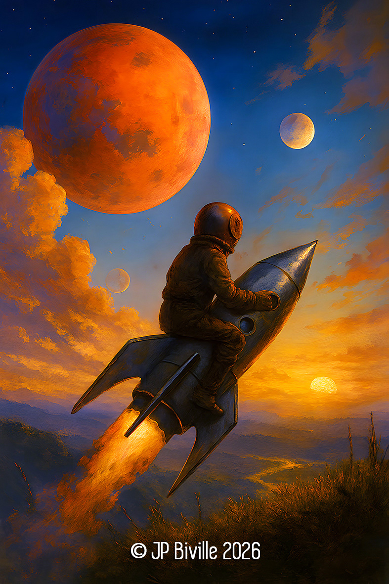 Cette image est une fiction. Une mise en scène de l’obsession contem-poraine pour l’ailleurs, pour le ciel, pour les planètes lointaines. Un astronaute solitaire chevauche une fusée dans un ciel saturé de mondes imaginaires. L’élan est puissant, le décor spectaculaire. Mais que cherche-t-on à fuir ?