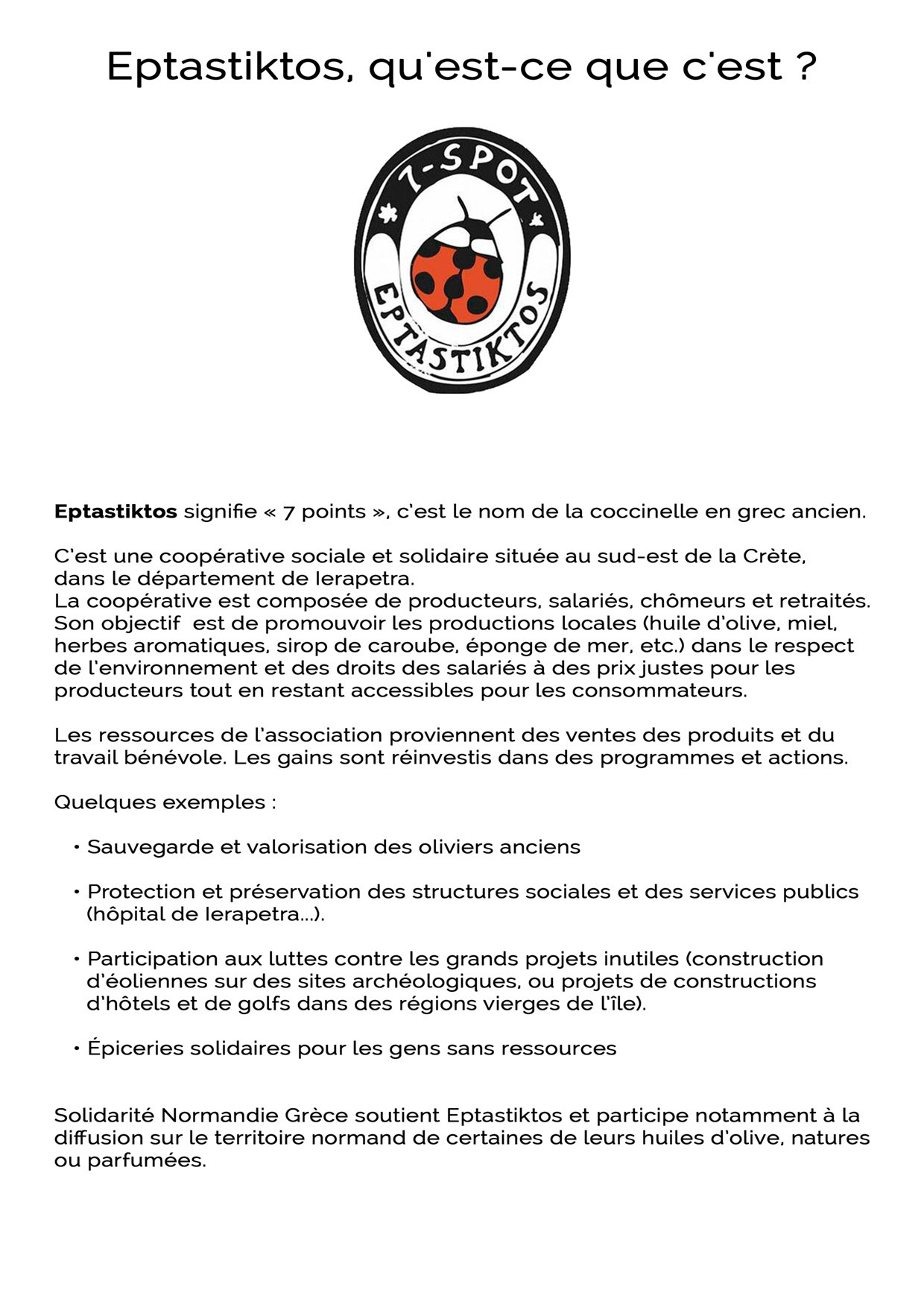 SNG aide également la coopérative sociale et solidaire EPTASTIKTOS à Ierapetra. Nous sommes, en Normandie, un des points de distribution de leur production d'huile d'olive bio, le seul en France à part la Grèce et l'Allemagne.